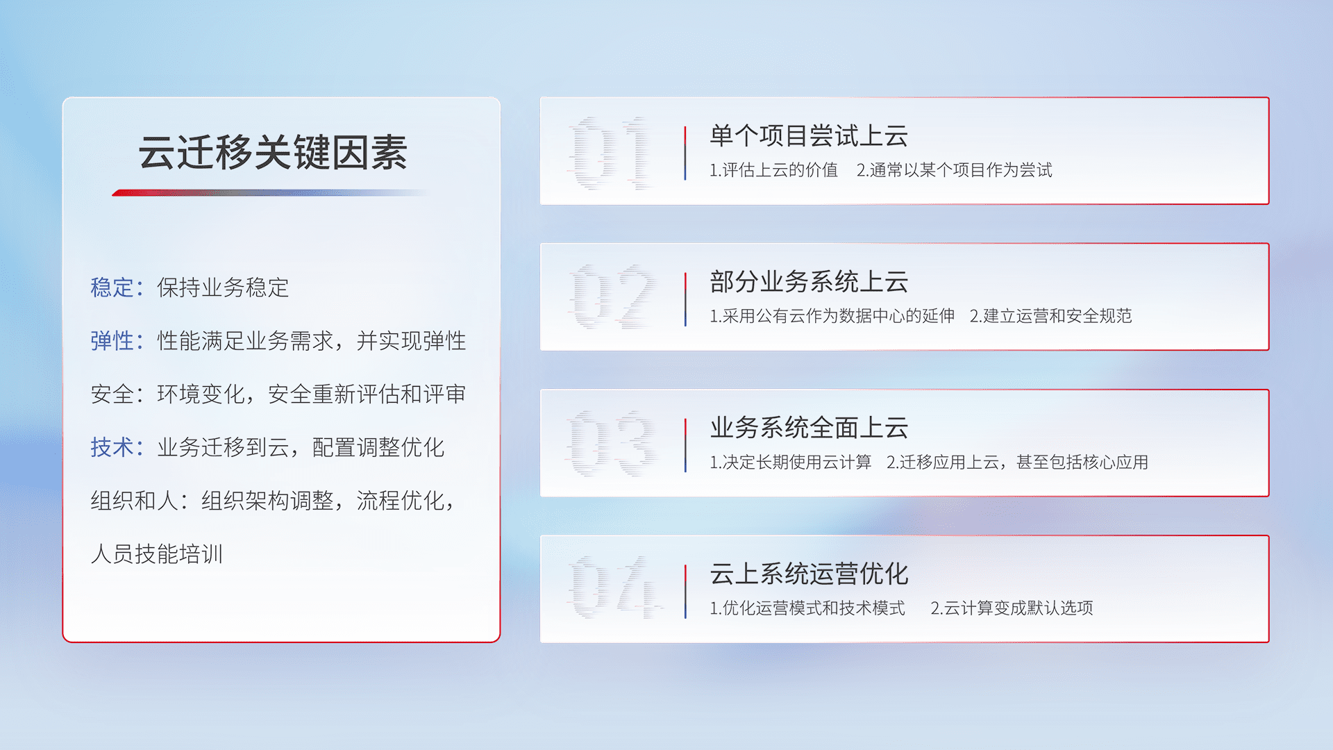结合实际业务,,从规划设计、、、、云平台选型、、、云原生改造、、、数据迁移、、、、集成交付,,,迁移全过程为客户识别最佳上云路径,,做好风险识别管理,,,设计网络架构、、、身份权限、、安全审计合规、、操作审计、、日志审计、、监控告警策略、、多站点容灾设计等,,对云上基础设施进行整体规划,,提升IT治理水平,,,,以满足弹性、、高可用、、、、高性能的需求。。
