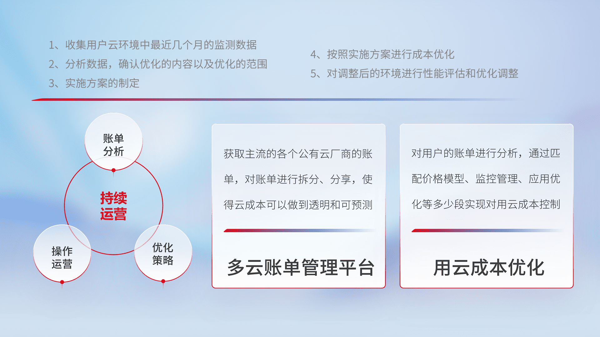 监控业务系统资源开销,,对资源的消耗精确计量,,实现费用的透明化管理,,,,不断提升资源使用率,,调整资源购买方式,,,降低资源费用成本,,,,用云成本可预测、、、用云费用可优化,,,,云资源配额有据可依。。