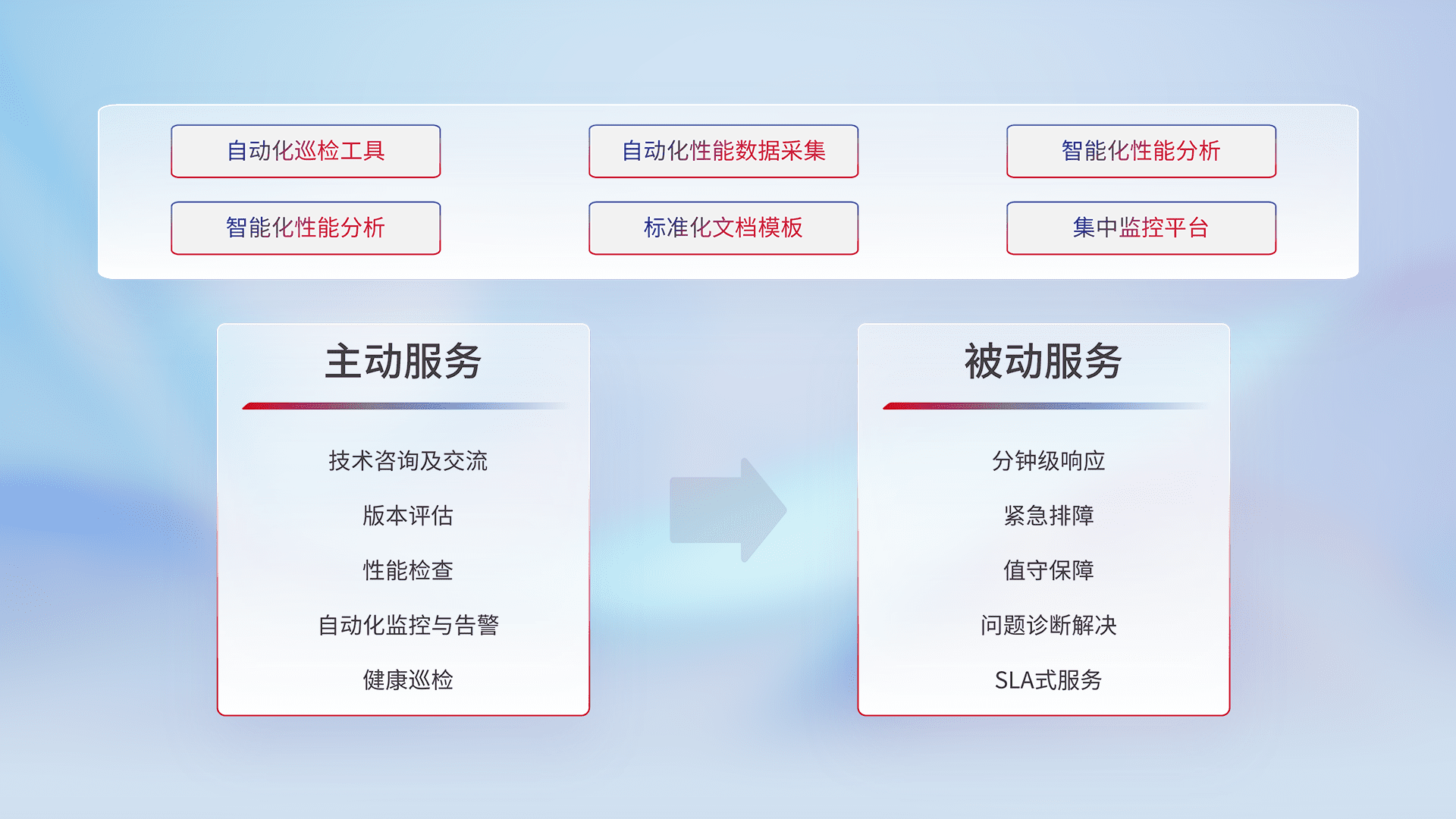 智能化工具和标准化文档,,,保障服务质量,,,,提供主动服务(包含技术咨询、、、、版本评估、、性能检查、、、、自动化监控与告警、、健康巡检)和被动服务包含(分钟级响应、、、紧急排障、、、、值守保障、、、、问题诊断解决、、SLA服务)。。。